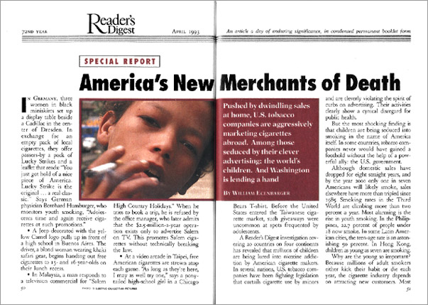 To research this investigative report, we sent author Bill Ecenbarger to five continents and requested contributions from all 48 editions around the globe. Besides commanding a lot of press attention, the report won us appearances on numerous talk shows and was nominated for a National Magazine Award. (To see a different kind of investigative piece, click here.)
