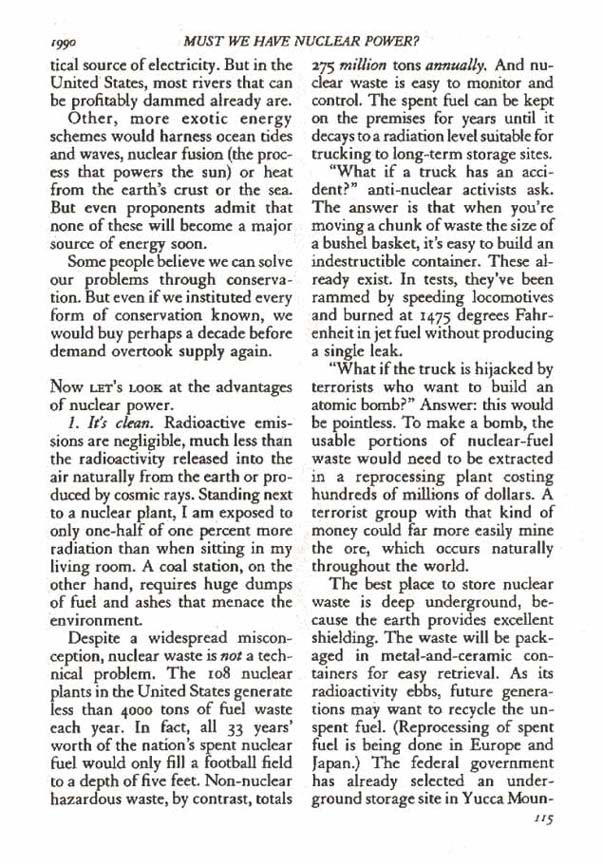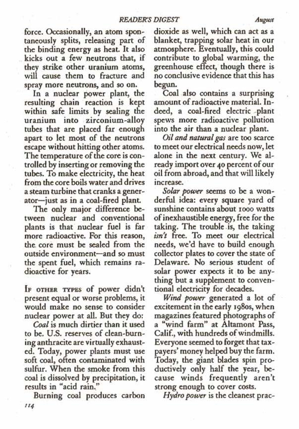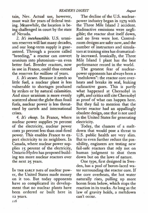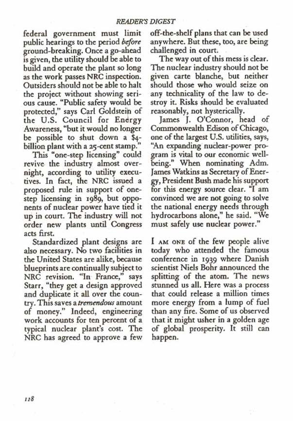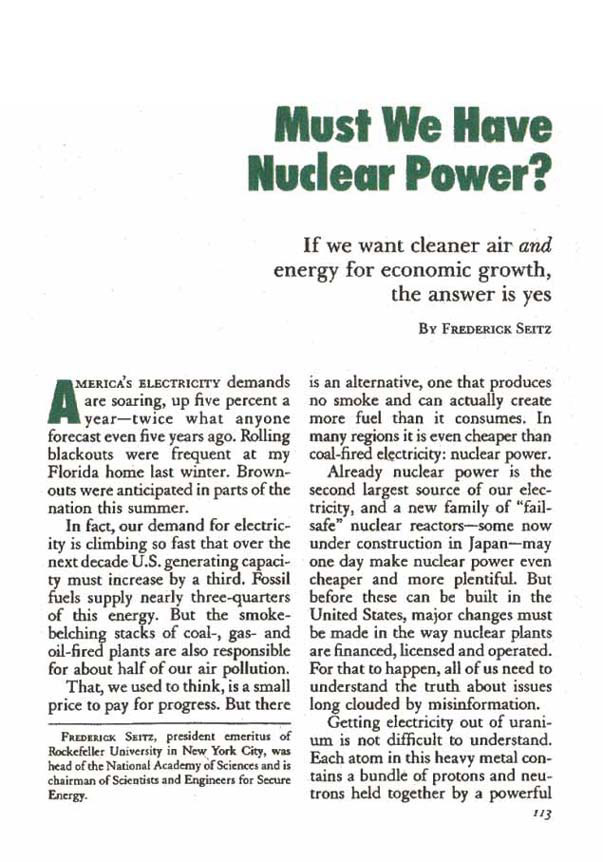 This was an unusually difficult ghost-writing project. It demanded that we take readers inside the technology of nuclear power instead of "writing around" it, as most magazines do—without violating Reader's Digest's reputation for brevity. It also required voicing consistent with a scientist of Seitz's stature. And finally, despite those strictures, it needed to keep readers' interest to the very end. Unlike many scientists, Seitz completely understood what I was trying to do, spent hours answering my questions, and approved the final draft with hardly a change.