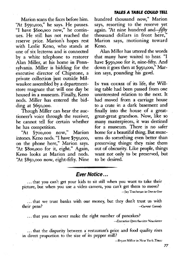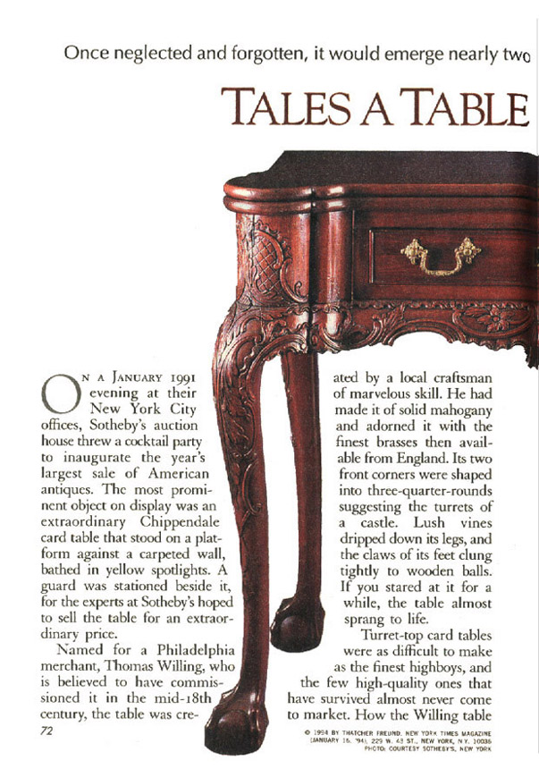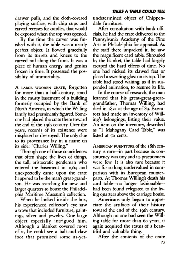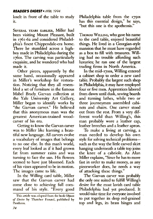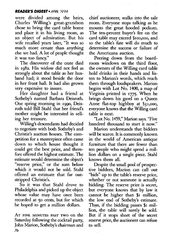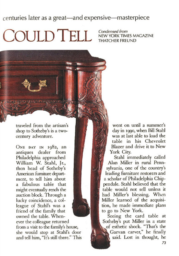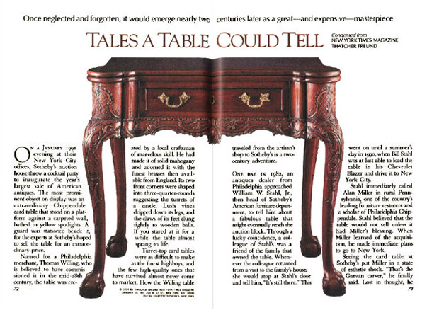 I spotted this article in the New York Times Magazine one Sunday afternoon while relaxing at home. It was long and rambling -- about four times the length we gave it. And typically for a news magazine, the piece spilled the beans up front, telling readers how much the exquisite card table had brought when auctioned at Sotheby's. I asked our cutters to recast the piece as a suspenseful chronology spanning the table's 200-year history and climaxing with the auction price. I also reminded them to alter as few words as possible, invoking old-time Digest editor Ken Payne's famous dictum: "If it is not necessary to change, it is necessary not to change." Here is the wonderful result.
