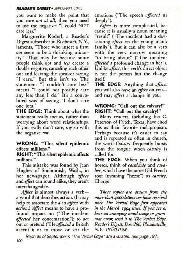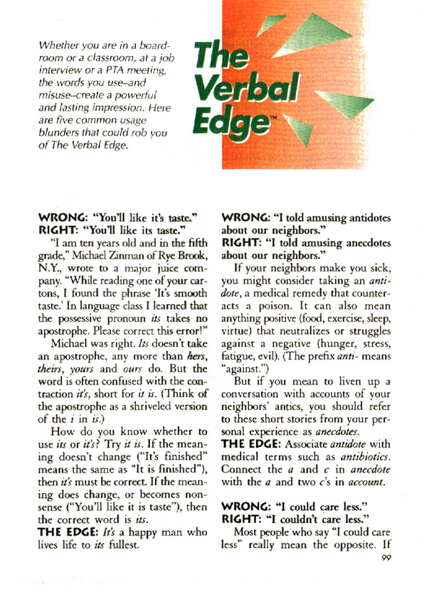 The Verbal Edge grew out of a lunch with Loretta Wilson, a former copy editor who had joined my staff. I named the department, helped Wilson and other staffers produce it, and contributed some of the items. It proved more popular than any new department in years, and released a torrent of suggestions from readers.